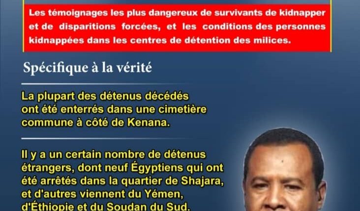 Parmi leurs crimes, il y a fait qu’un certain nombre de citoyens détenus qui se trouvaient dans leurs entrepôts sont morts lors de l’attaque de leurs entrepôts à Khartoum « 2 » et ils n’ont pas pu les faire sortir, donc parmi eux se trouvaient des gens de Soudan de Sud, et ils les font confiance l’un des crimes les plus inquiétants contre l’humanité et la nation est que les trafiquants de drogue sont arrêtés, que « les drogues de glace et de bingo sont confisquées ». Et d’autres drogues les marchands sont libérés en échange du paiement d’une somme d’argent, et il y a des gens qui avaient de l’or de leur côté avec qui on a négocié et l’or a été confisqué. En l’absence de loi, il est confisqué en faveur de la milice.