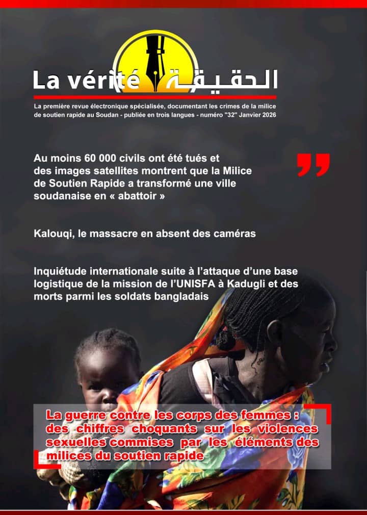 Le première Magazine électronique périodique spécialisée dans la documentation des crimes de la milice terroriste du Soutien Rapide au Soudan, pour qu’il soit une référence aux organisations et mécanismes internationaux concernés à la protection des droits de l’homme dans le monde – Edition « 32 » – Janvier 2026.